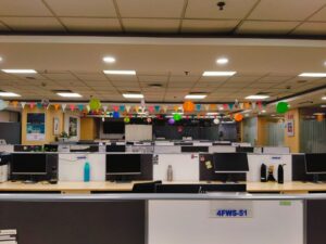 As soon as one stepped into the office, they were greeted by a sea of colors. The entrance and passage were adorned with colorful fabric, setting the tone for the festivities. The addition of umbrellas at the entrance added a playful touch, while the floral decorations sprinkled throughout the area added a touch of elegance.